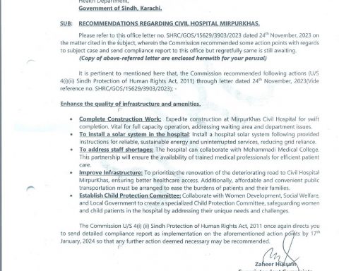 The Sindh Human Rights Commission conducted a comprehensive inspection of Civil Hospital MirpurKhas in December 2023 and subsequently forwarded recommendations to enhance and improve the overall healthcare facilities in the region. These recommendations were communicated to the Secretary